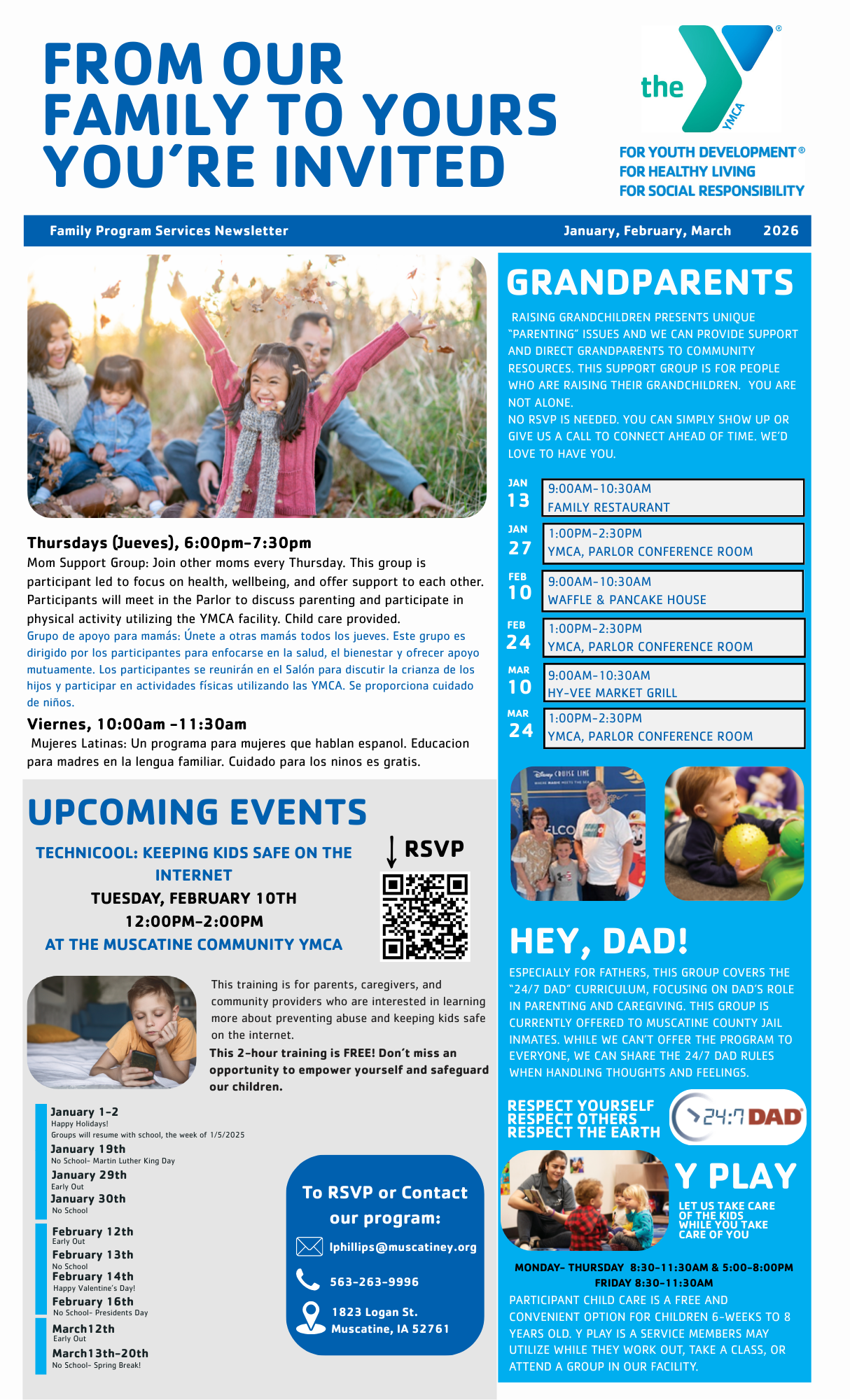 We support families through Family Focus, Self-Sufficiency, Parent Education, Grandparents Raising Grandchildren, and Respite Programs.Family Program Services (FPS) provides parents with parenting information, support, and the opportunity to explore issues particular to their needs. FPS groups address the special needs of both parent and child. All classes and groups are free, and child care is provided at the Y free of charge during all group meetings. For more FPS programs, individualized programming and information, please call Lindsey Phillips at 563-263-9996.